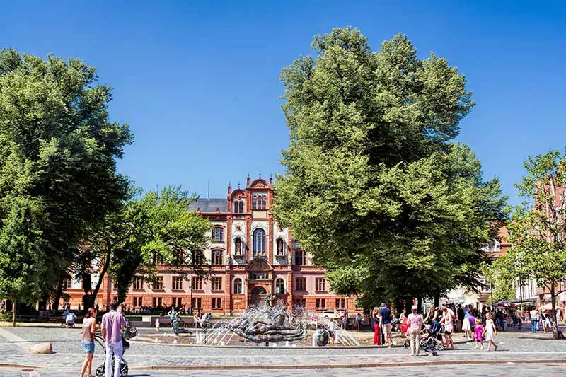 Der Universitätsplatz in Rostock ist das pulsierende Herz der Stadt und ein idealer Ausgangspunkt für Entdeckungen. Seit dem 15. Jahrhundert ist dieser Platz ein zentraler Treffpunkt. Umgeben von historischen Gebäuden, wie dem prächtigen Hauptgebäude der Universität Rostock, bietet der Platz dir eine faszinierende Mischung aus Geschichte und studentischem Leben. Besonders attraktiv sind die modernen Brunnenanlagen (auch liebevoll „Pornobrunnen“ genannt) und die zahlreichen Cafés, die dich zum Verweilen einladen. Hier kannst du das lebendige Treiben beobachten und gleichzeitig die beeindruckende Architektur genießen.