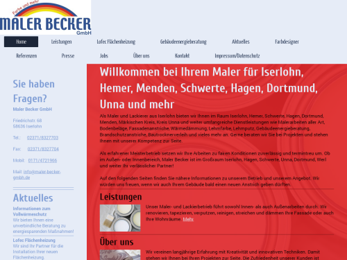 Als Maler und Lackierer aus Iserlohn bieten wir Ihnen im Raum Iserlohn, Hemer, Schwerte, Hagen, Dortmund, Menden, Märkischen Kreis, Kreis Unna und weiter umfangreiche Dienstleistungen wie Malerarbeiten aller Art, Bodenbeläge, Fassadenanstriche, Wärmedämmung, Lehmfarbe, Lehmputz, Gebäudeenergieberatung, Brandschutzanstriche, Bautrocknerverleih und vieles mehr an. Gerne beraten wir Sie bei Projekten und stehen Ihnen mit unserer Kompetenz zur Seite.