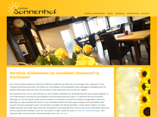 Wenn Sie eine Unterkunft im Illertal benötigen und genug von unpersönlichen Pensionen haben, ist das Hotel Sonnenhof in Illertissen der richtige Ansprechpartner für Sie. Rufen Sie uns an oder schicken Sie uns eine Zimmeranfrage über das Internet. Es erwartet Sie ein als Familienbetrieb geführtes Hotel, das Ihnen neben einer ruhigen und traumhaft schönen Lage einen freundlichen und kompetenten Service bietet. Unser oberstes Anliegen ist es, dass Sie sich bei uns rundum wohlfühlen.