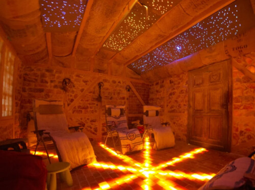In unserer Salzgrotte wurden insgesamt 20 t Salz verbaut. Sie besteht aus reinsten Naturmaterialien. Die Luftfeuchigkeit beträgt ca. 35%. Während der 55 Minuten dauernden Sitzung erfahren Sie eine kontinuierlich mehrfach gefilterte Frischluftzufuhr. Der wichtigste Heilfaktor der gesteuerten Halotherapie ist die mit trockenem Salz gesättigte Luft.