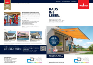 Von der Beratung bis zur Montage sind wir Ihr Partner für hochwertige Markisen und Terrassenüberdachungen aus dem Hause weinor. Daneben umfasst unsere Produktpalette ausgereifte Insekten- und Blickschutzlösungen. Für ein freundliches Erscheinungsbild Ihres Hauses sorgen unsere modernen Haustüren mit den dazu passenden Vordächern. Einen ganzjährig freien Blick ins Grüne ermöglichen unsere Wintergärten.