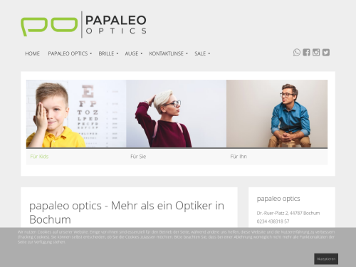 In Bochum sorgt unser freundliches Team von Papaleo Optics dafür, dass Sie sich mit Ihrer neuen Brille oder mit Kontaktlinsen rundum wohlfühlen. Mit Ideen und Vorschlägen schaffen wir die Voraussetzung für eine individuelle Lösung, die auf Ihre Persönlichkeit angepasst ist. Selbstverständlich finden Sie bei uns nicht nur die richtige Sehhilfe, sondern wir bestimmen auch gern in einem Sehtest mit modernster Technik Ihre Sehstärke.