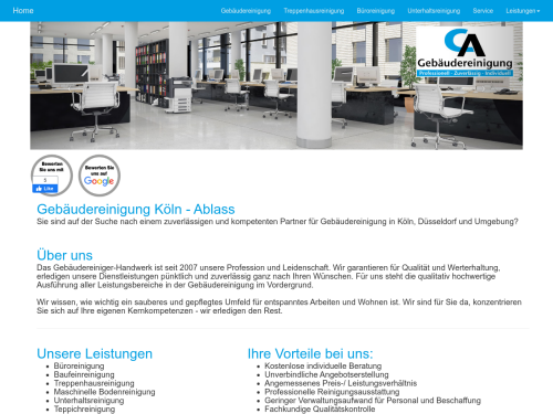 Unser Unternehmen Gebäudereinigung Ablass ist in Köln ansässig und bereits seit dem Jahr 2007 in der Büroreinigung tätig. Zuverlässigkeit und qualitativ hochwertig durchgeführte Dienstleistungen stehen in unserer Firmenphilosophie an oberster Stelle. Zudem stehen wir für ein ausgewogenes Preis-Leistungs-Verhältnis. Wir verfügen über erfahrene und geschulte Mitarbeiter, die Ihren Reinigungsauftrag termingerecht erfüllen. Kontaktieren Sie uns in unserer Niederlassung in Köln, wir unterbreiten Ihnen gerne ein unverbindliches Angebot!