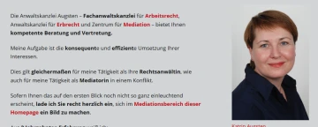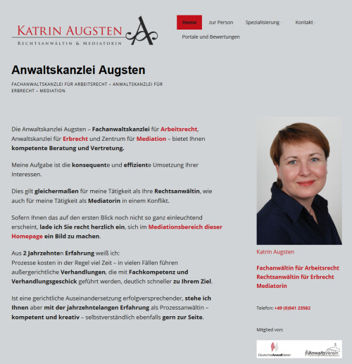 In der Anwaltskanzlei Augsten in Regensburg geht es darum, Sie in einer schwierigen und ungewohnten Situation zu unterstützen. Deshalb stehe ich, Katrin Augsten, Ihre Fachanwältin für Arbeitsrecht , Rechtsanwältin für Erbrecht, Ihnen auch direkt zur Verfügung, wenn Sie mich anrufen.