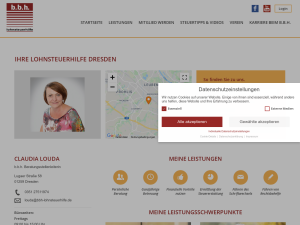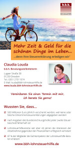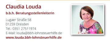 Benötigen Sie Unterstützung bei Ihrer Steuererklärung? Die b.b.h. Lohnsteuerhilfe e.V. ist Ihr zuverlässiger Ansprechpartner, wenn es um die Einkommenssteuer geht. Frau Claudia Louda ist dabei Ihre erfahrene und kompetente Beraterin im Raum Dresden. Wir haben Ihre persönlichen und individuellen Umstände stets im Auge und gewährleisten somit die optimale Steuererstattung. Bereits seit 1991 unterstützen wir unsere Kunden erfolgreich in steuerlichen Belangen. Nehmen Sie gerne telefonisch oder per Mail Kontakt auf, oder lassen Sie sich vor Ort informieren. Wir freuen uns auf Sie.