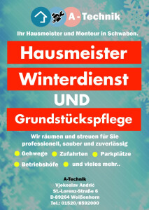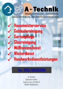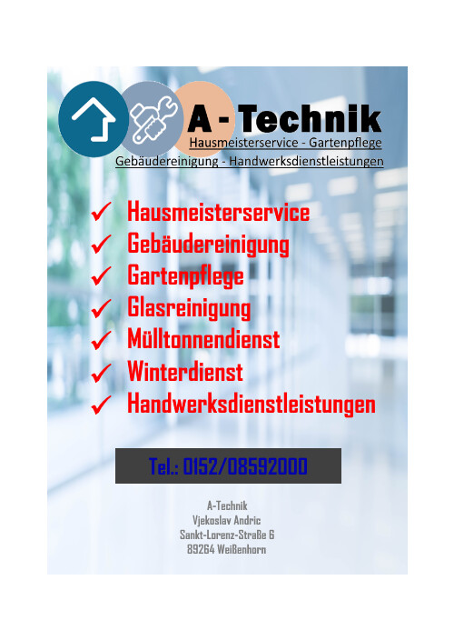 A-Technik ist Ihr professioneller Hausmeisterservice in Weißenhorn der ersten Wahl. Unser junges Unternehmen zeichnet sich in vor allem durch Zuverlässigkeit, höchste Qualitätsansprüche und eine faire, transparente Preisgestaltung aus. Gerne sind wir für Sie in ganz Schwaben im Einsatz. Wir freuen uns schon sehr auf Ihre Kontaktaufnahme per Mail oder Telefon!