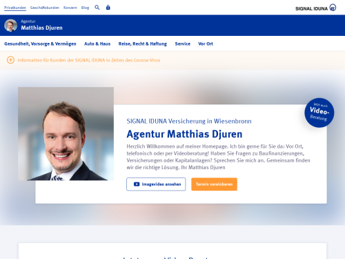 Wünschen Sie sich von Versicherungsvermittlern eine fachkundige Beratung, die genau auf Ihre Bedürfnisse eingehen kann? Dann würde ich mich freuen, wenn Sie sich an mich wenden. Mein Name ist Matthias Djuren und ich leite in Wiesenbronn die Hauptagentur von SIGNAL IDUNA. Als regionale Anlaufstelle für verschiedene Versicherungsfragen stehe ich Ihnen dabei persönlich, telefonisch oder per Videoberatung zur Verfügung. Ich nehme mir die nötige Zeit, Ihre Situation zu klären, sodass Sie zugeschnittene Leistungen erhalten.