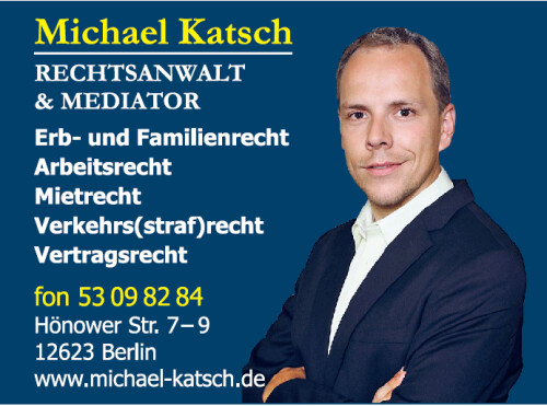 Die Kanzlei Michael Katsch aus Berlin ist Ihre erste Anlaufstelle, wenn Sie einen Rechtsanwalt konsultieren möchten. In unserer Kanzlei kennen wir uns mit einer Vielzahl von Rechtsgebieten aus. Egal, ob Sie einen Fachanwalt für Erbrecht, Arbeits-, Familien-, Miet-, Nachbarschafts-, Verkehrs oder Urheberrecht suchen, bei uns sind Sie an der richtigen Adresse. Wir vertreten Sie in diesen und anderen Bereichen vor und außerhalb des Gerichts. Dabei legen wir großen Wert auf eine schnelle Einigung zu Ihrer Zufriedenheit. Rufen Sie uns an und lassen Sie sich beraten.
