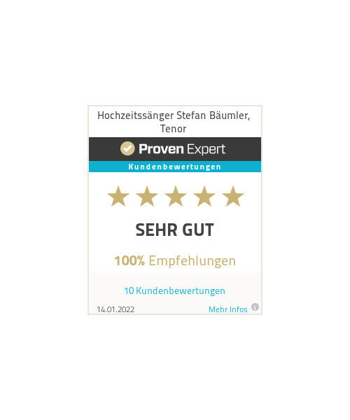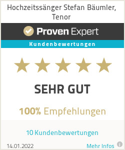Diplom Sänger mit über 20 Jahren Erfahrung und Top Referenzen, TV Auftritte u.a. bei "Verstehen Sie Spaß?". Buchbar zur Hochzeit, zum Geburtstag, zur Geschäftsfeier, zur Silberhochzeit / Goldenen Hochzeit, zur Taufe, zur Beerdigung