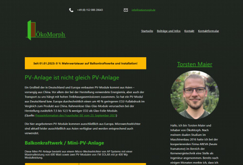 ÖkoMorph, unter der Leitung von Torsten Maier und ansässig in Kassel, hat es sich zur Aufgabe gemacht, den Übergang zu erneuerbaren Energien zu vereinfachen und für jeden zugänglich zu machen. Spezialisiert auf die Installation von Solaranlagen, bieten wir maßgeschneiderte Lösungen, von innovativen Mini-PV-Systemen und Balkonkraftwerken bis hin zu umfassenden Photovoltaikinstallationen mit Batteriespeichern. Unser Ziel ist es, Ihnen eine unabhängige und umweltbewusste Energieversorgung zu ermöglichen.