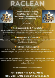 Unser Engagement für höchste Qualitätsstandards, Zuverlässigkeit und Diskretion macht uns zum bevorzugten Partner vieler zufriedener Kunden in der Region. Durch regelmäßige Schulungen unserer Mitarbeiter garantieren wir eine stetige Verbesserung unserer Dienstleistungen. Bei RACLEAN setzen wir auf Nachhaltigkeit, Professionalität und eine enge Kundenbeziehung, um genau die Serviceleistung zu bieten, die Sie benötigen.