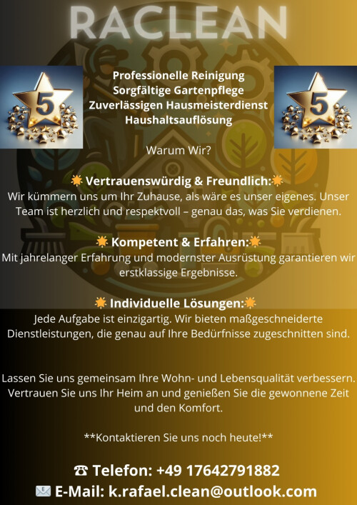RACLEAN Reinigungsservice aus Hamburg steht für exzellente Sauberkeit in jedem Bereich. Unsere Expertise erstreckt sich über Gebäudereinigung bis hin zur Garten- und Landschaftspflege. Mit einem breiten Spektrum an Dienstleistungen, darunter Bauend-, Solaranlagen-, Altenheim-, Büroraum-, Praxisreinigung sowie private Haushaltsreinigungen und Unterhaltsreinigung, bieten wir maßgeschneiderte Lösungen für jeden Bedarf. Unser Ziel ist es, durch unsere Arbeit die Lebens- und Arbeitsqualität unserer Kunden signifikant zu verbessern.