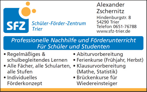 Das Schüler-Förder-Zentrum in Trier unterstützt Schüler, Berufsschüler und Studierende bei der Erreichung Ihrer Lernziele. Für unser breites Lehrangebot stehen motivierte, erfahrene und konzeptionell geschulte Lehrkräfte zu Verfügung. Das Lernmaterial der verschiedenen Leistungsstufen wird im Einzel- oder Kleinstgruppenunterricht vermittelt. Unser Zentrum legt großen Wert auf den persönlichen Umgang sowie individuelle Lernförderung. Bei Bedarf betreuen und unterstützen wir die Lernenden auch über einen längeren Zeitraum und stehen unterstützend zur Seite. Ihre Zufriedenheit steht im Fokus unseren Handelns.