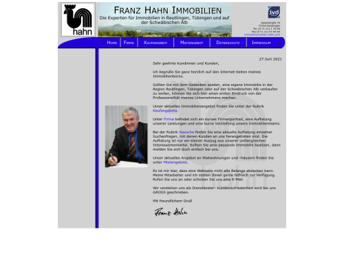 Ich bin Franz Hahn und Immobilienmakler in Reutlingen. Mein Unternehmen führe ich bereits seit 1976, sodass ich meinen Kenntnisstand fortlaufend ausbauen konnte. Ich bin Mitglied des Immobilienverbands Deutschland (IVD) und gehöre dem Gutachterausschuss der Stadt Reutlingen an. In Reutlingen und Umgebung gelten wir mit unseren Dienstleistungen rund um verschiedene Immobilien als Institution. Jüngst stießen meine beiden Kinder zu meinem Familienunternehmen, sodass die Kontinuität gesichert ist. Als Firma haben wir unseren Fokus auch auf Immobilien in Tübingen sowie der Schwäbischen Alb gerichtet.