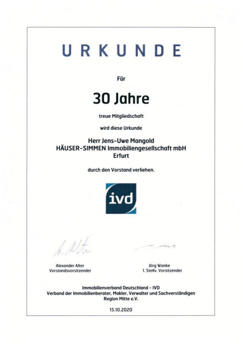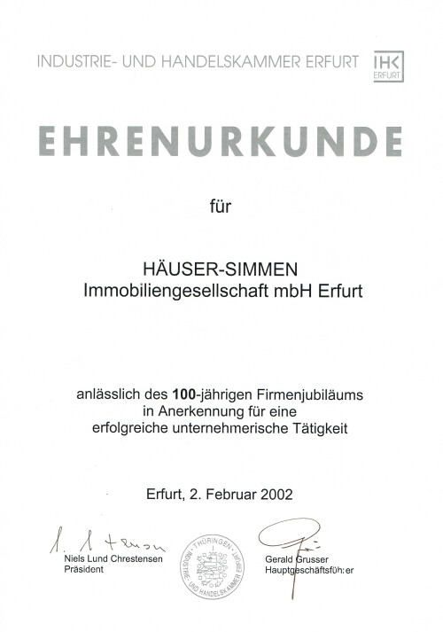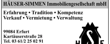 Möchten sie eine Immobilie verkaufen oder erwerben? Dann ist die Häuser-Simmen Immobiliengesellschaft mbH Ihr sach- und fachkompetenter Immobilienmakler in Erfurt, gegründet 1902. Wir verfügen über langjährige Erfahrung und einen hohen Bekanntheitsgrad in unserer Region. Daraus resultiert ein für unsere Branche einmaliger Wissensschatz, den wir Ihnen gerne zur Verfügung stellen möchten.