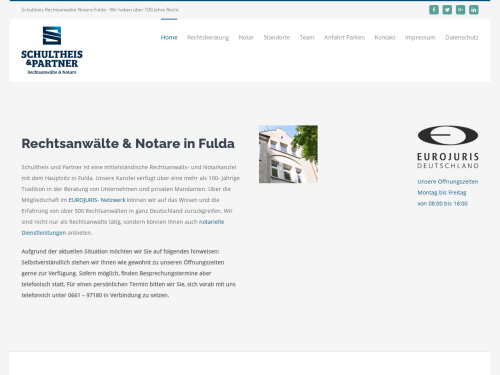 Im Recht zu sein ist nicht immer die Garantie dafür, auch Recht zu bekommen. Diese Erfahrung hat wohl jeder schon einmal gemacht. In Fulda und Umgebung vertreten wir Sie gern, wenn Sie juristischen Beistand benötigen. Egal ob Rechtsfragen zum Immobilienrecht oder Erbrecht, unser Rechtsanwalt der entsprechenden Fachrichtung übernimmt gern Ihre Vertretung. Unsere Kanzlei Schultheis - Hanke & Kollegen wurde bereits 1907 von Richard Schultheis Senior gegründet. Seit der Wiedereröffnung 1945 wurde die Kanzlei stetig vergrößert und arbeitet bis heute erfolgreich mit mehreren Partnern zusammen. Ob Sie eine Rechtsberatung im Immobilienrecht, Erbrecht, Gesellschaftsrecht oder Baurecht benötigen, bei uns finden Sie den Rechtsanwalt für das entsprechende Fachgebiet.