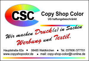 Kommen Sie bei uns im Copy Shop Color in Reichenbach vorbei, wenn es um Drucksachen hochwertiger Art geht. Unsere Ausstattung ist auf dem aktuellsten Stand und garantiert Ihnen stets hervorragende Ergebnisse, wenn es um das Drucken, Scannen oder Kopieren geht. Mit viel Erfahrung und großem Know-how stehen wir zur Verfügung und beraten Sie gern ganz individuell. Wir freuen uns auf Sie!