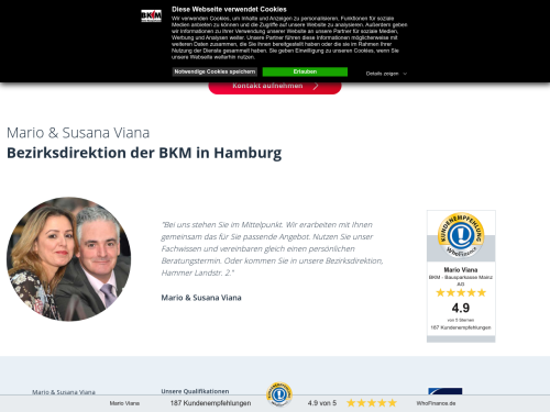 Unsere Immobilienmakler Mario und Susana Viana von der BKM Bausparkasse Mainz sind bereits seit langem für Sie in der Branche tätig und wissen daher genau, auf welche Aspekte es bei Fragen der Finanzierung ankommt. In der Bezirksdirektion erhalten Sie auf Anhieb einen umfangreichen Beratungstermin, in dessen Rahmen wir Ihnen ein persönliches Profil anlegen. Herausragende Bewertungen bisheriger Kunden zeigen, dass wir mit diesem Ansatz stets gut fahren. Als geprüfte Bauspar- und Finanzierungsfachmänner überzeugen wir zudem mit einer herausragenden Ausbildung. Unser Betrieb befindet sich in Hamburg, wo wir Sie gerne zu einem Gespräch begrüßen.