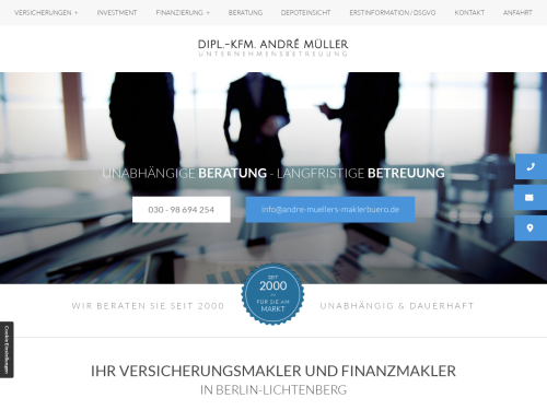 Bereits seit dem Jahr 2000 biete ich, André Müller, Unternehmen aller Branchen betriebswirtschaftliche Unterstützung auf höchstem Niveau in Berlin. Darüber hinaus bin ich als Versicherungsmakler Ihr optimaler Ansprechpartner für effiziente Absicherungs- und Vorsorgekonzepte. Dank meiner Unabhängigkeit ist es mir möglich, Ihnen frei von äußerer Einflussnahme ausschließlich maßgeschneiderte Konzepte zu präsentieren. Dabei stehen Ihre wirtschaftlichen Interessen und Bedürfnisse immer im Vordergrund.