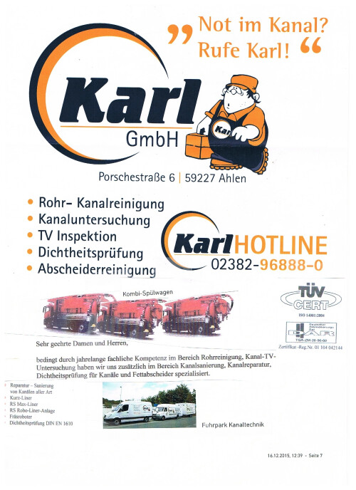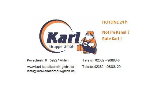 Die Firma Karl GmbH sorgt seit über 40 Jahren für klare Verhältnisse in Kanälen in Ahlen und Umgebung. Kompetent und zuverlässig führen wir Rohrreinigungen, Kanalreinigungen sowie Kanalsanierungen durch. Durch stetige Fortbildungen können wir Ihnen moderne Methoden im Bereich der Abflussreinigung und seit 2008 auch Dichtheitsprüfungen anbieten. Regionale Referenzen weisen uns als Experten für Kanalreinigungen und Kanalsanierungen in Ahlen aus. Daneben bieten wir Ihnen ebenfalls die Wartung und Überprüfung Ihres Fett- oder Ölabscheiders an. Nutzen Sie unsere langjährige Erfahrung!