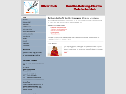 An Ihrem Haus stehen Modernisierungsarbeiten an? Kommen Sie zu Sanitär - Heizung - Solar Inh. Oliver Eich in Leverkusen. Wir sind Ihre Experten für Elektrotechnik, Heizungsinstallation, Umwelt- und Solartechnik und Kernbohrungen. Auch bei Planung und Installation sind wir Ihre kompetenten Ansprechpartner mit langjähriger Erfahrung.