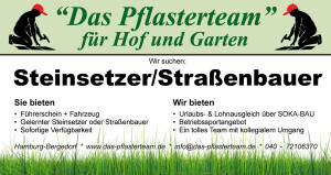 Sie suchen eine neue Herausforderung als Straßenbauer / Pflasterer in Hamburg? Werden Sie jetzt Teil des tatkräftigen Teams von "Das Pflasterteam für Hof und Garten" und verstärken Sie uns ab sofort in den Bereichen Pflasterungen, Plattierungen und Randeinfassungen. Erwarten Sie einen sicheren Arbeitsplatz in einem professionell geführten Betrieb.